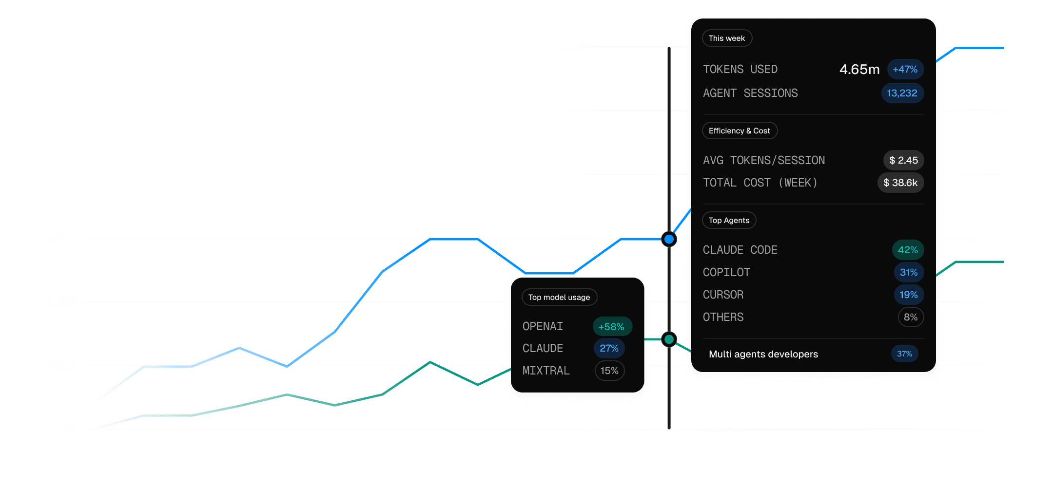 Dexicon reports token usage, developer usage, and agent metrics with full visibility.