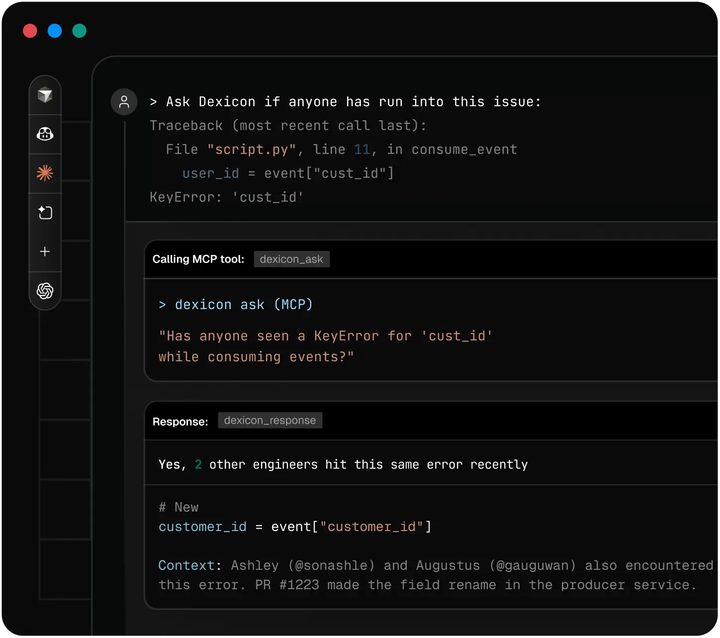 Dexicon indexes agent sessions, docs, and SDLC data to surface relevant context and enable memory for your team's AI coding agents.