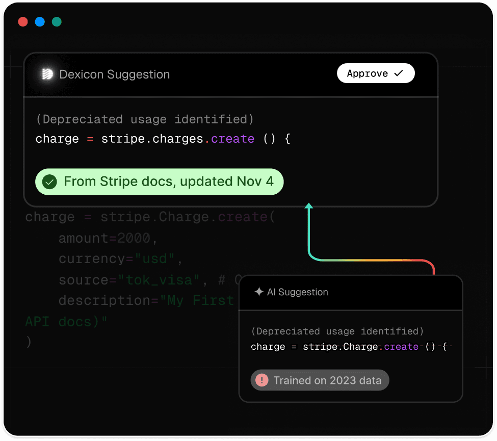 Dexicon extracts insights from your synced sessions to ground your coding agent in up-to-date knowledge.